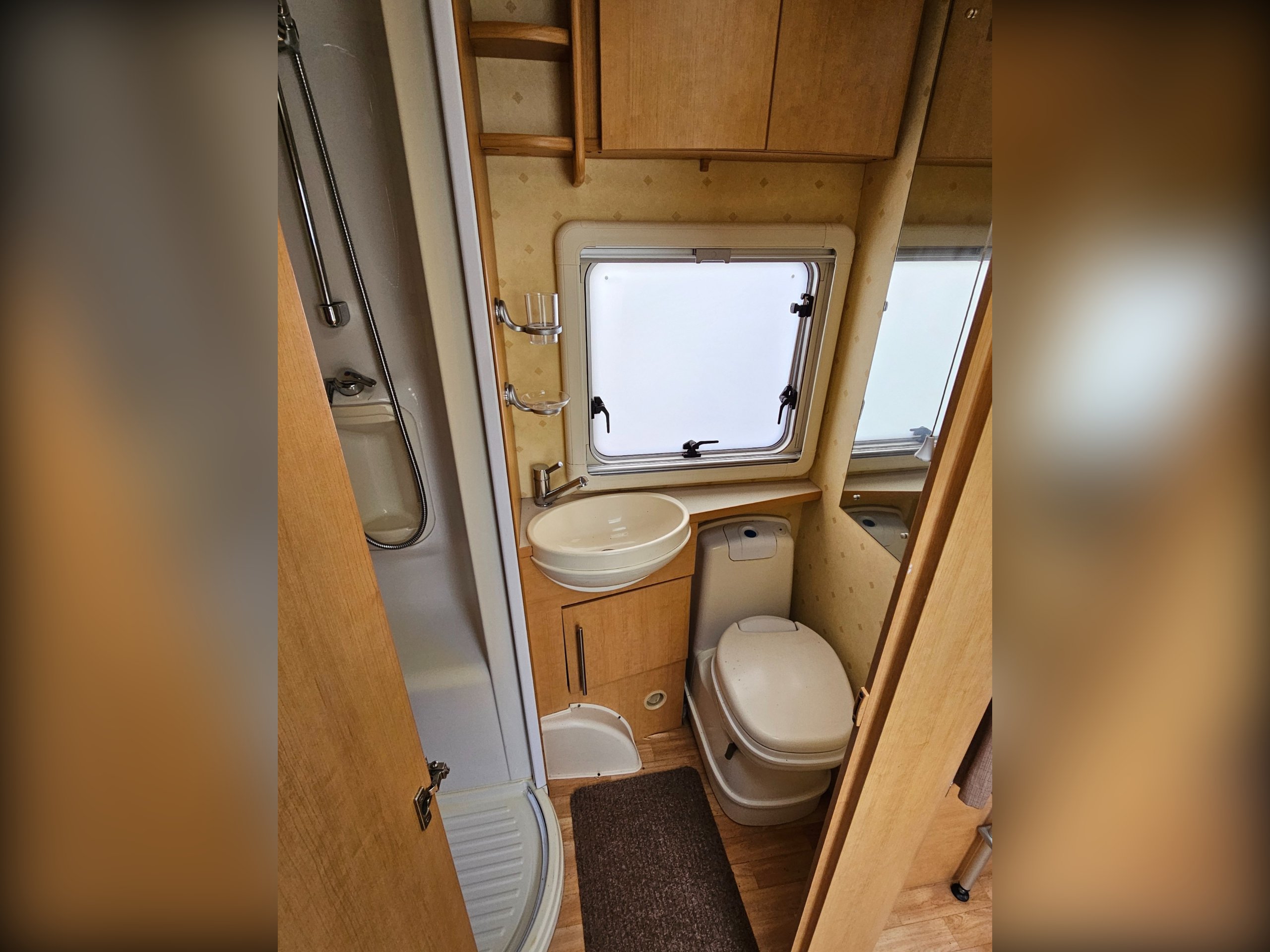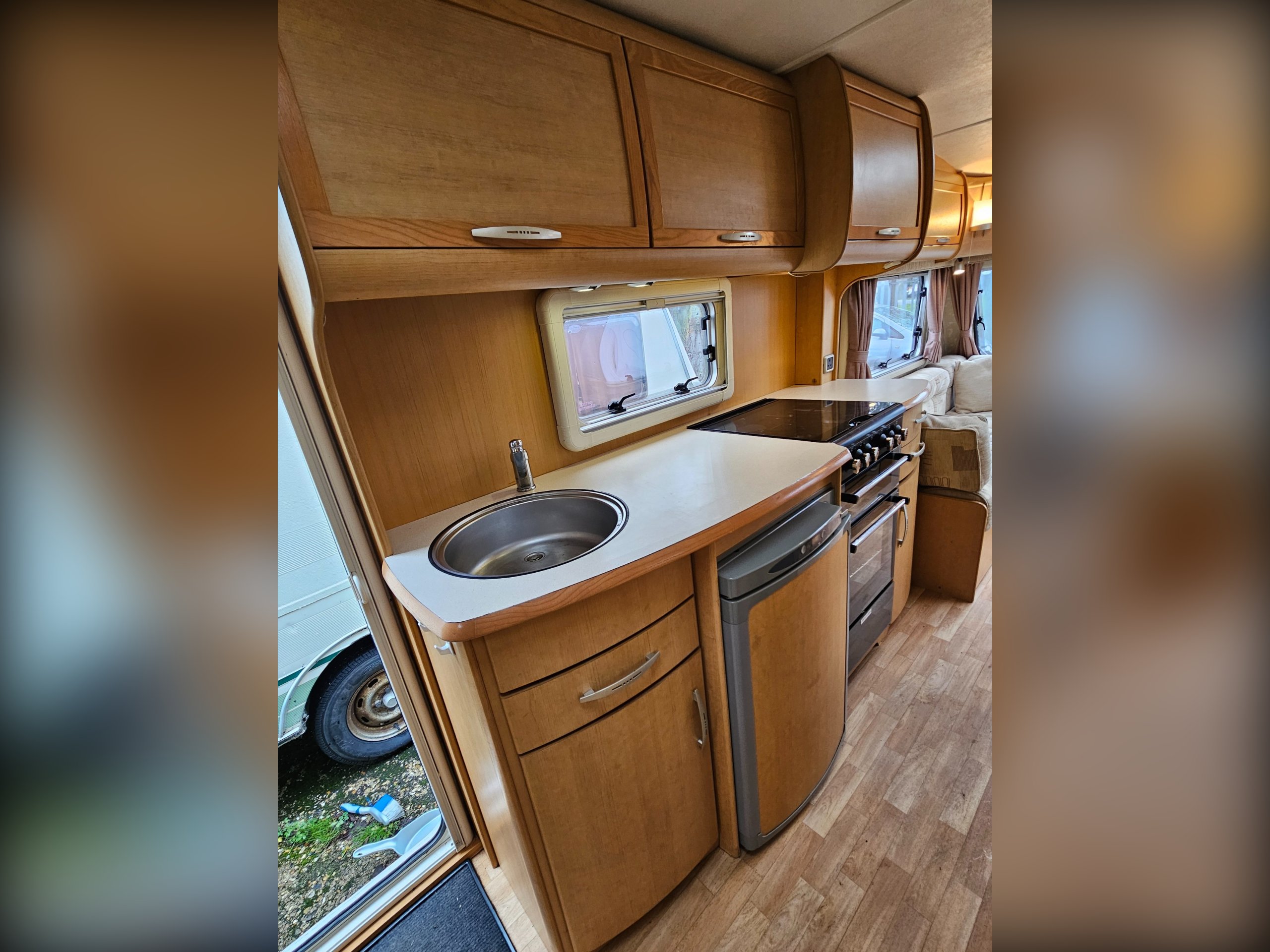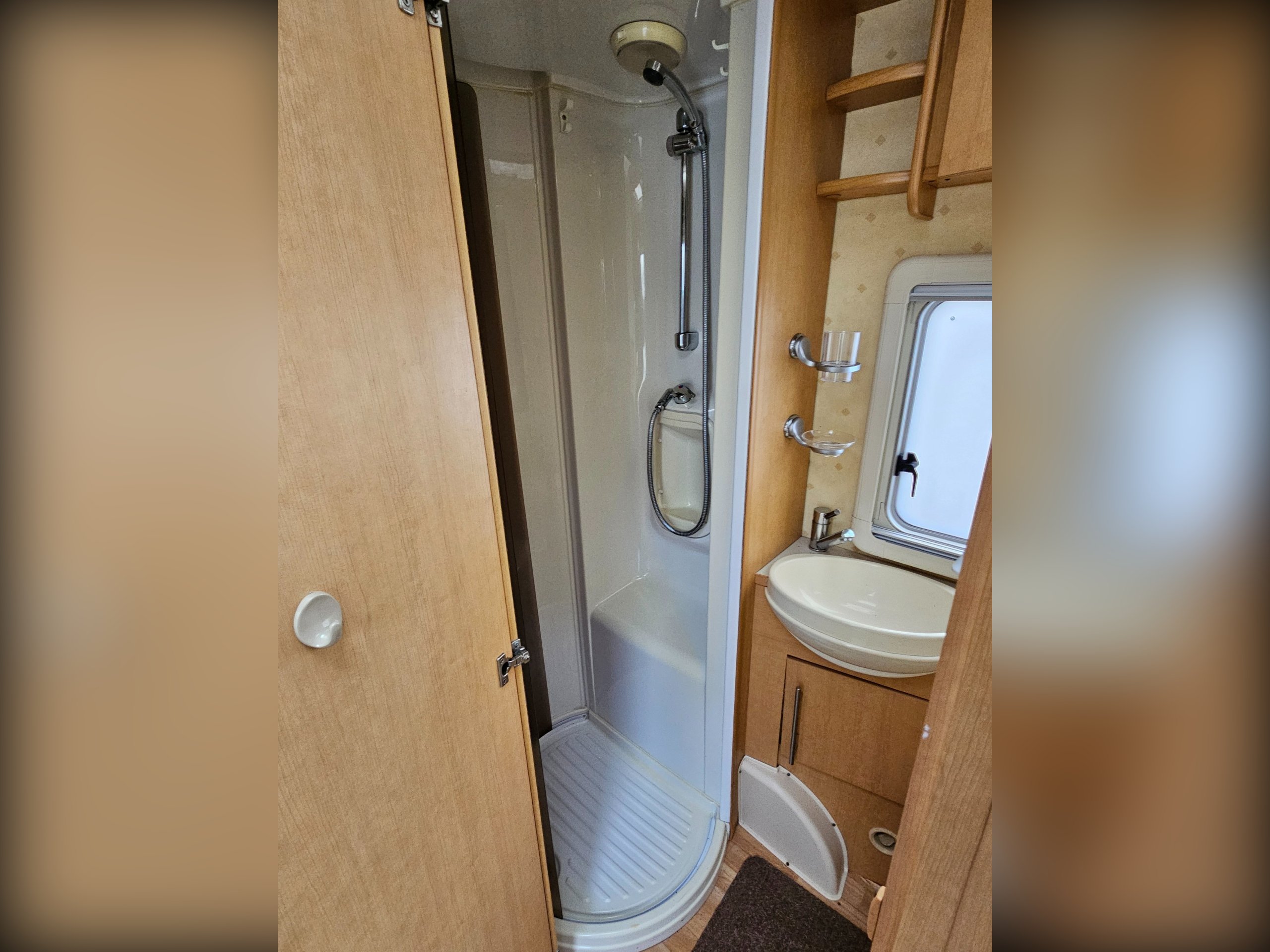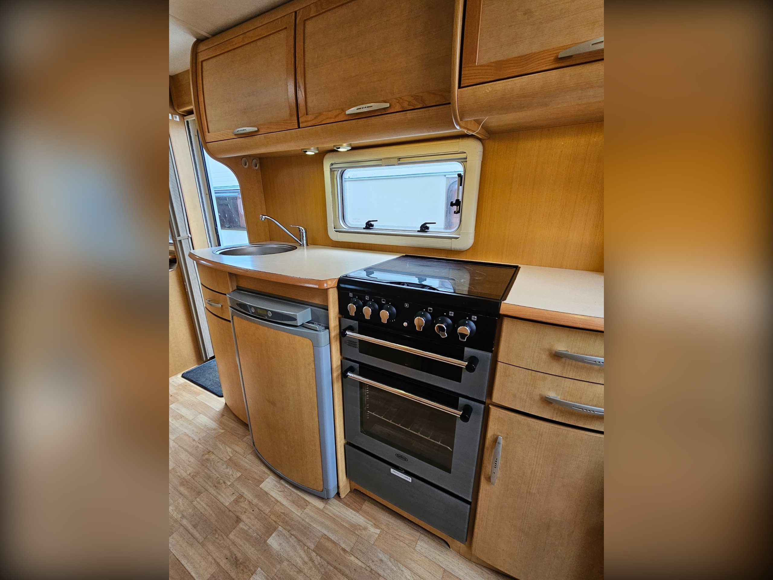 The centre kitchen offers a full cooker (4 ring hob, grill, oven), sink and 3-way fridge. There is also space to fit a microwave. The centre washroom includes a cassette toilet, hand basin and separate shower.