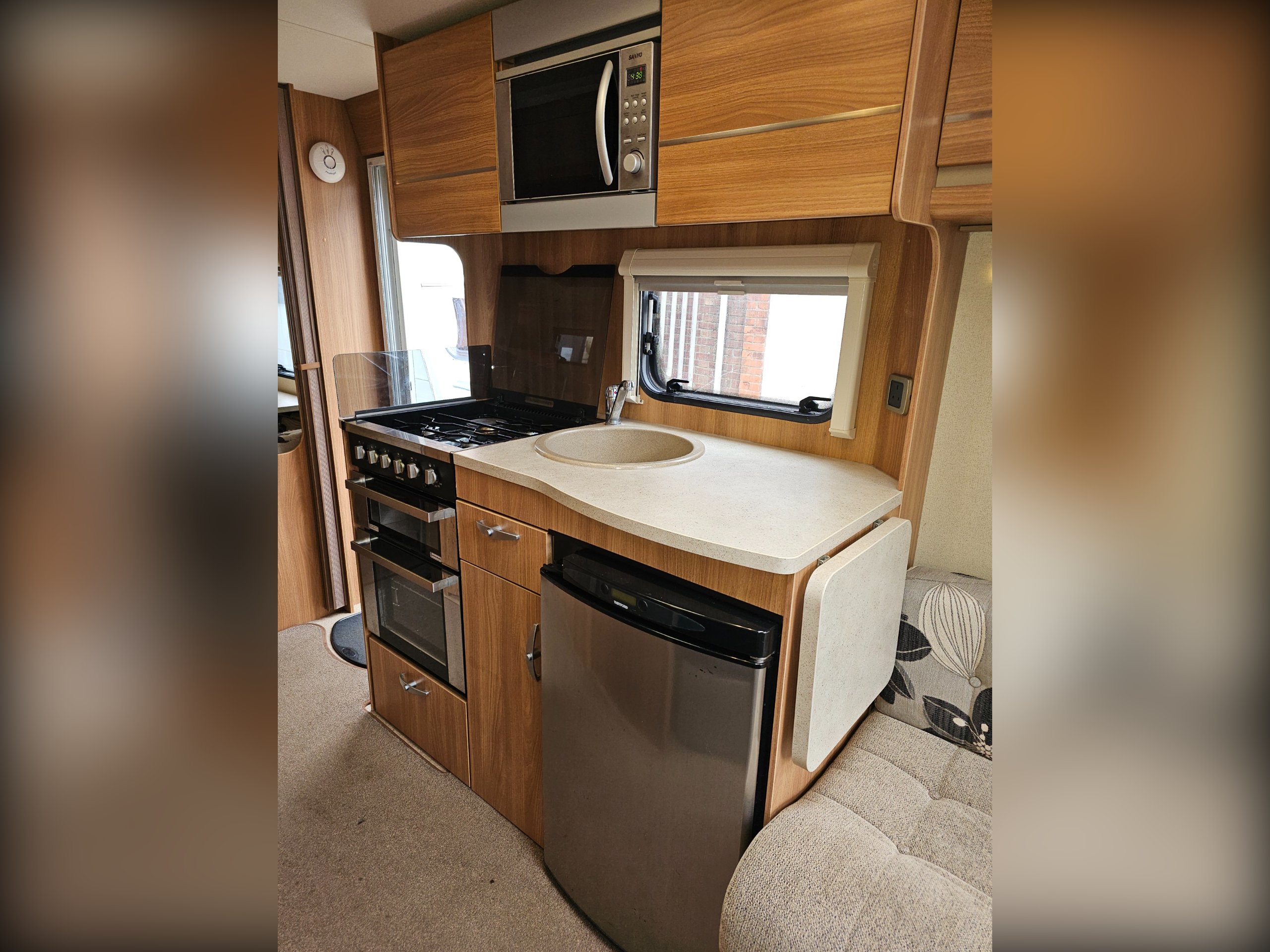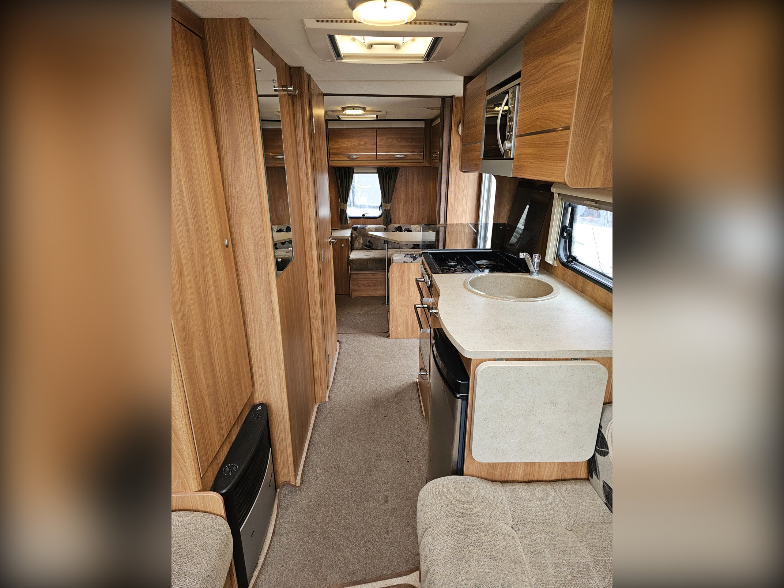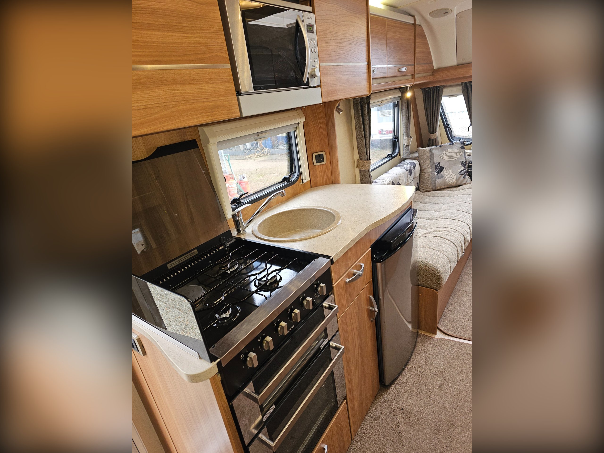 There is, of course, a front lounge that can convert into a double bed. The centrally located kitchen has a full cooker (4 burner hob, grill, oven), sink, 3-way fridge and microwave. Next to the wardrobe, also centrally located, is the washroom including the cassette toilet, hand basin and separate shower.