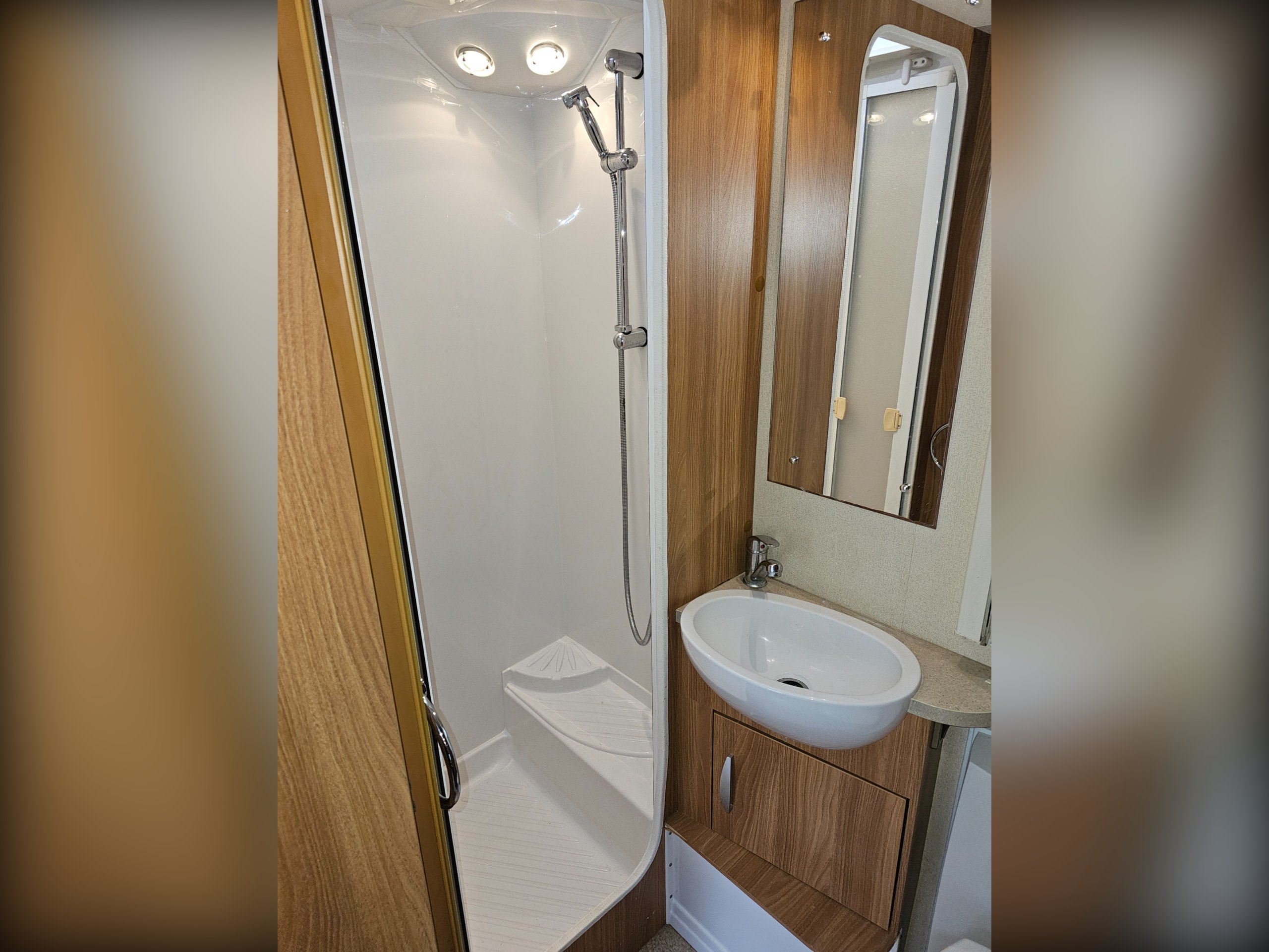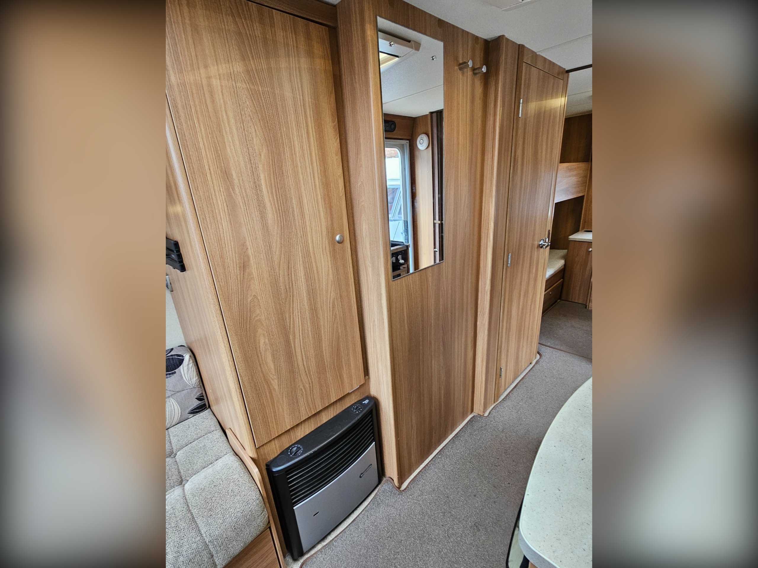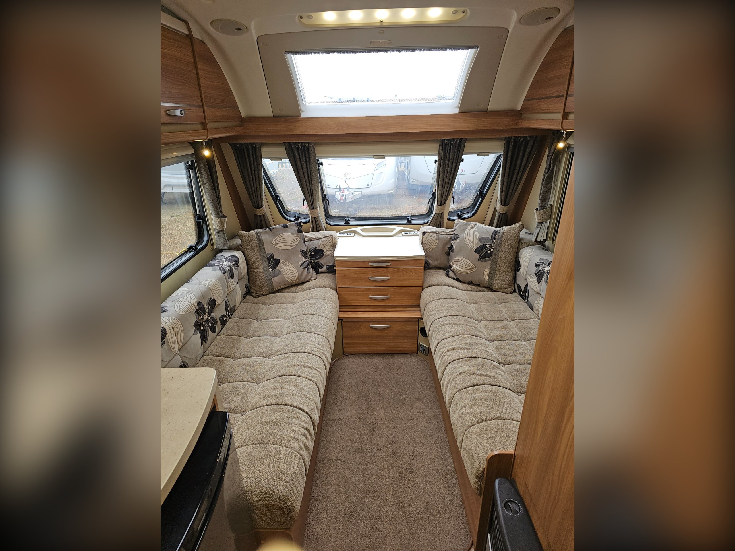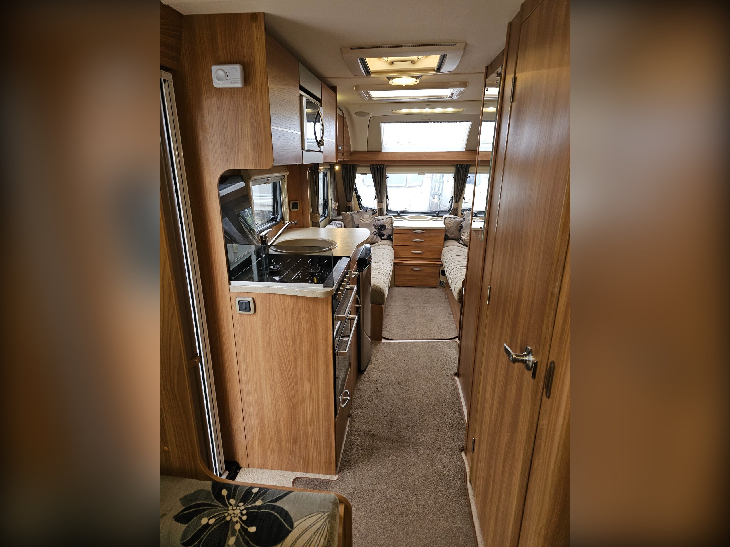 There is, of course, a front lounge that can convert into a double bed. The centrally located kitchen has a full cooker (4 burner hob, grill, oven), sink, 3-way fridge and microwave. Next to the wardrobe, also centrally located, is the washroom including the cassette toilet, hand basin and separate shower.